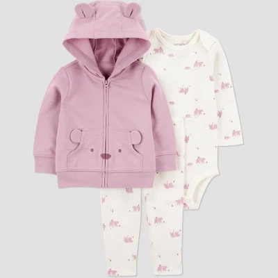 Baby is cozy and stylish in this layered look by Carter’s Just One You. This 3-piece set for baby has everything you need for the changing season – a hooded jacket layered over a short sleeve bodysuit and matching pants with a fun print. Your tiny trendsetter is ready for park playdates, birthday parties, and everything in between. Giving style and convenience, the bodysuit has overlap shoulders for easy dressings and strong snaps at the legs!