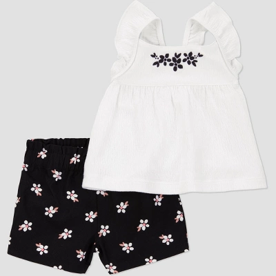 Summer wardrobe loading. This fun 2-piece outfit set for baby girl from Carter’s Just One You features one sleeveless white top with delicate floral embroidery and coordinating shorts. These adorable matching shorts have an allover white geometric print. Just add sandals and she’s ready to go. Dress her up in this sunny weather look for parties, playdates, and anything in between. This 2-piece summer outfit for baby girl makes a great gift too!